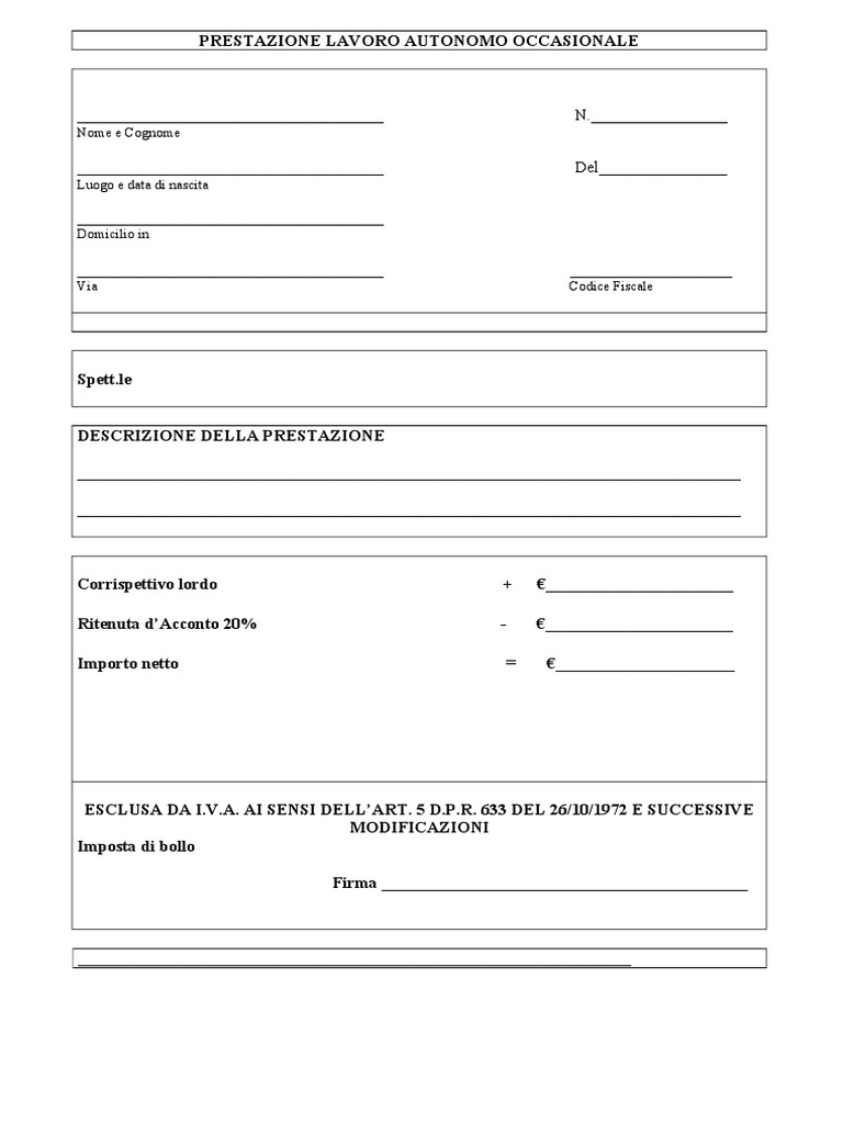 leggi l'articolo completo qui : http://www.gruppoarealavoro.it/lavoro-e-previdenza/contratto-di-prestazione-occasionale-e-lavoro-autonomo-occasionale-che-confusione/ Fac simile prestazione occasionale, fac simile ricevua prestazione occasionale, prestazioni occasionali, ricevuta compenso prestazione occasionale, ricevuta prestazione occasionale. Questo significa che quanti vogliono emettere fattura senza partita iva fino a 5.000 euro, devono fare attenzione ad operare con i requisiti visti in precedenza, altrimenti si incorre in sanzione. Logico serve per farsi pagare però non è una fattura, la data non deve essere successiva al.